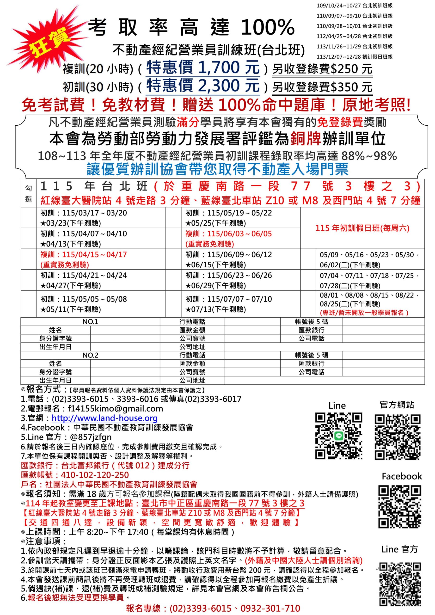 - 課程名稱:115/06/23-06/26不動產經紀營業員初訓課程★06/29下午測驗